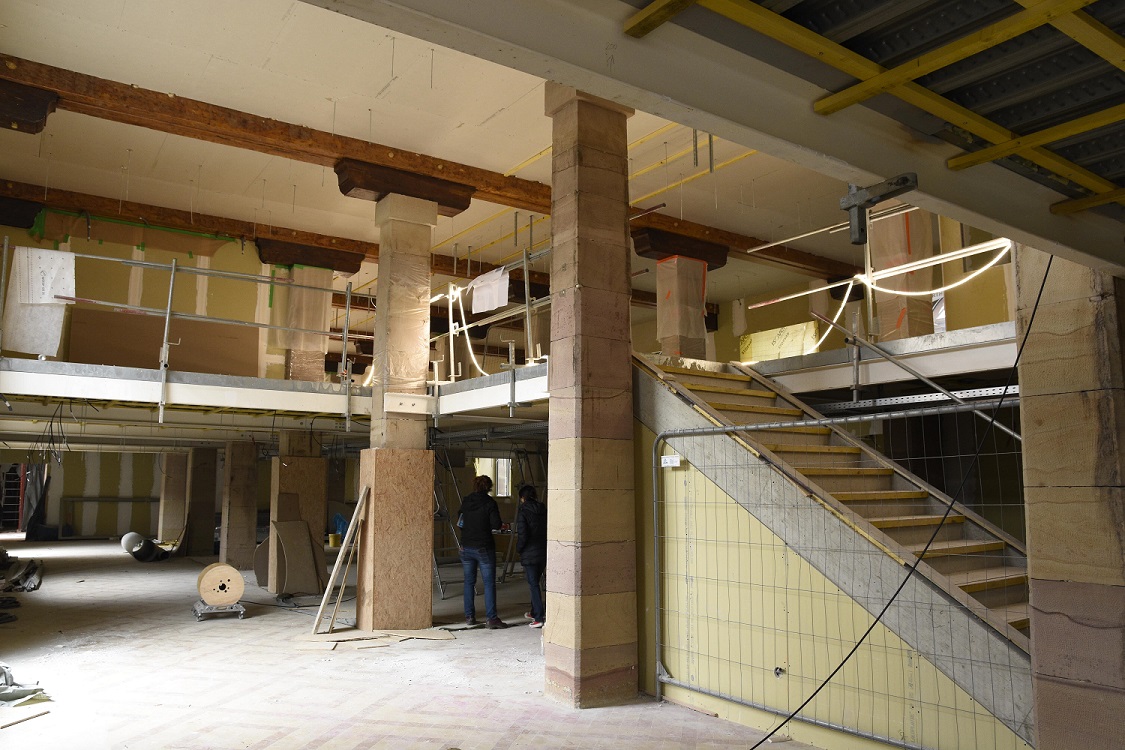 On commence par l'accueil de la bibliothèque. Située à proximité de l'escalier, la banque de prêt fera face au sas d'entrée, non aménagé pour l'instant. Cet endroit permet d'apprécier la hauteur de cette pièce de la Manufacture qui accueillait autrefois des masses de fermentation (meules de tabac).